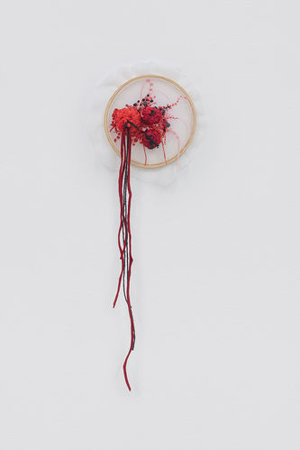 Bastidor, tecido voil, fios de linhas, malha e barbante em diferentes espessuras, crochê e bordado, 17cm de diâmetro x 4,5 cm.
